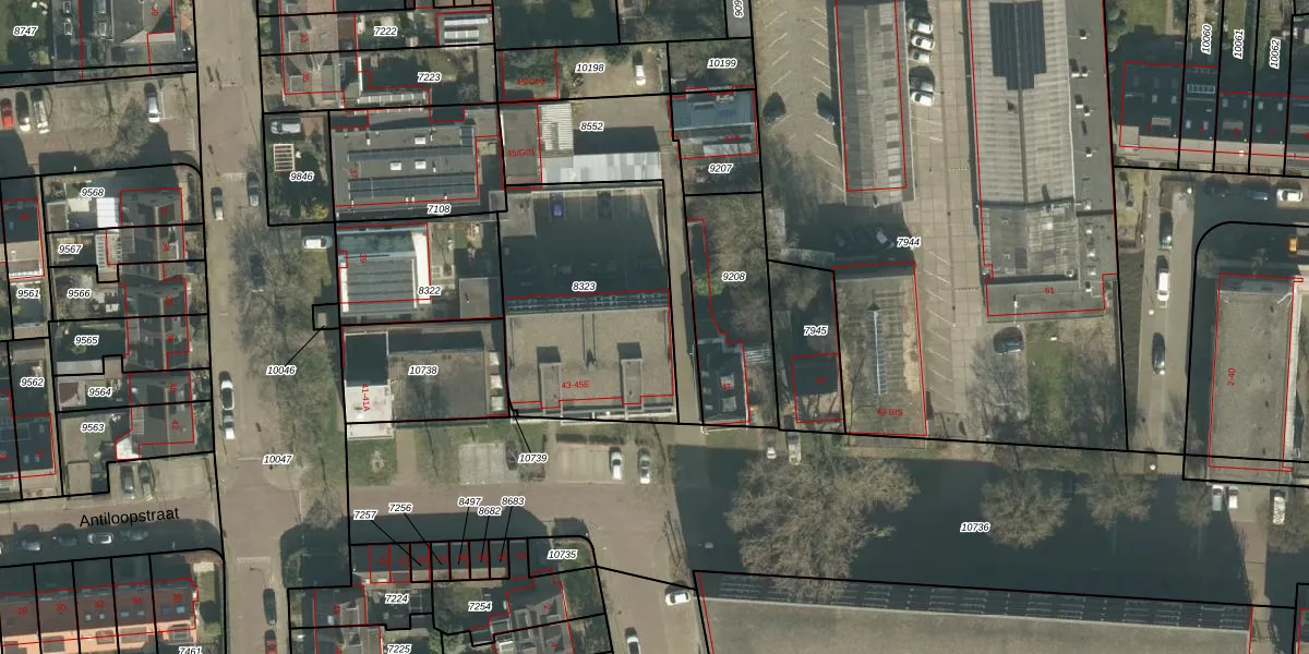 Antiloopstraat 45-E is gelegen op kadastraal perceel BDA00D8323. Deze kadastrale aanduiding is uniek en wordt gebruikt door het Kadaster om eigendomsrechten en andere zakelijke rechten vast te leggen. Het perceel maakt onderdeel uit van de kadastrale gemeente Breda.