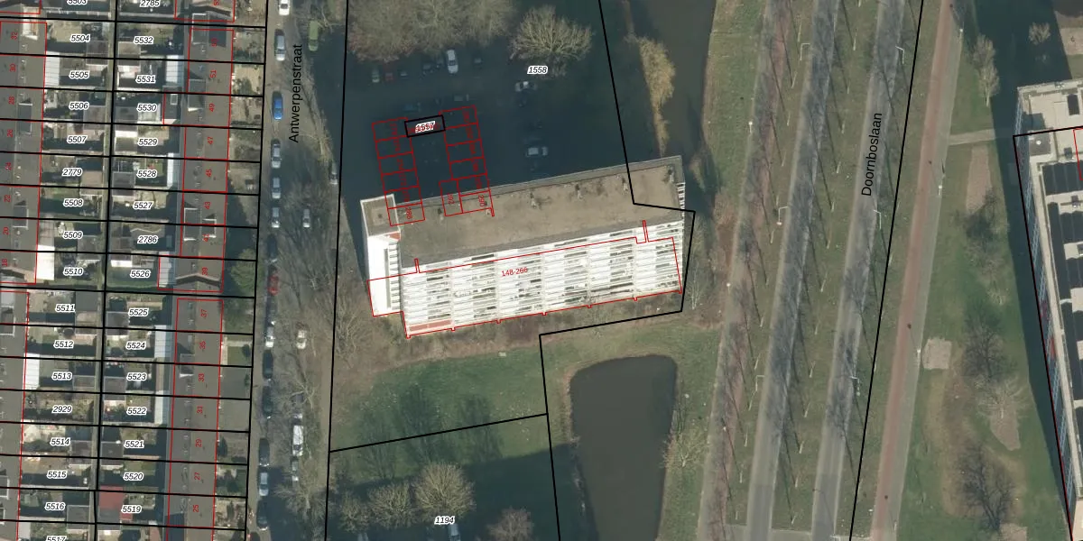 Het perceel waarop Antwerpenstraat 194 staat heeft een oppervlakte van 4502 m². Dit is een zeer groot perceel. De perceeloppervlakte wordt geregistreerd door het Kadaster. Gedetailleerde informatie over de maten van dit perceel kunt u vinden in het rapport Kadastrale kaart met maatvoering van Antwerpenstraat 194.