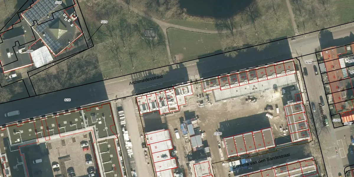 Het perceel waarop Archimedesstraat 31 staat heeft een oppervlakte van 5261 m². Dit is een zeer groot perceel. De perceeloppervlakte wordt geregistreerd door het Kadaster. Gedetailleerde informatie over de maten van dit perceel kunt u vinden in het rapport Kadastrale kaart met maatvoering van Archimedesstraat 31.