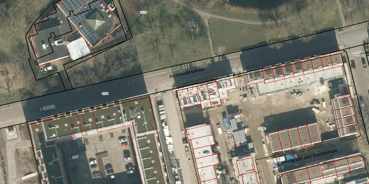 Het perceel waarop Archimedesstraat 39 staat heeft een oppervlakte van 5261 m². Dit is een zeer groot perceel. De perceeloppervlakte wordt geregistreerd door het Kadaster. Gedetailleerde informatie over de maten van dit perceel kunt u vinden in het rapport Kadastrale kaart met maatvoering van Archimedesstraat 39.