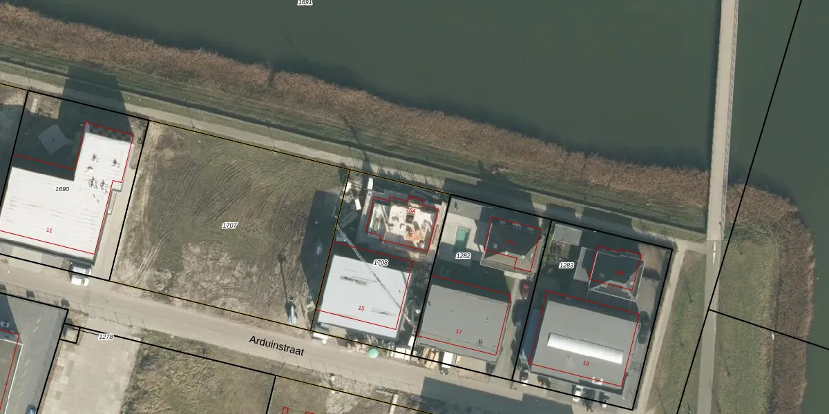 Het perceel waarop Arduinstraat 15-A staat heeft een oppervlakte van 996 m². Dit is een groot perceel. De perceeloppervlakte wordt geregistreerd door het Kadaster. Gedetailleerde informatie over de maten van dit perceel kunt u vinden in het rapport Kadastrale kaart met maatvoering van Arduinstraat 15-A.