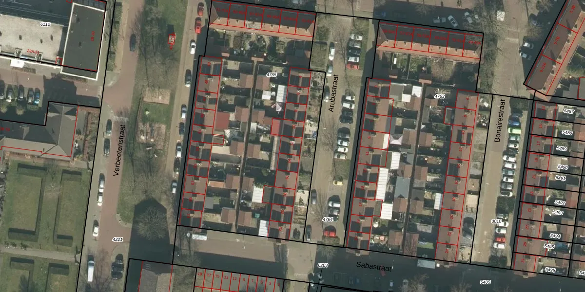 Het perceel waarop Arubastraat 12 staat heeft een oppervlakte van 3267 m². Dit is een zeer groot perceel. De perceeloppervlakte wordt geregistreerd door het Kadaster. Gedetailleerde informatie over de maten van dit perceel kunt u vinden in het rapport Kadastrale kaart met maatvoering van Arubastraat 12.