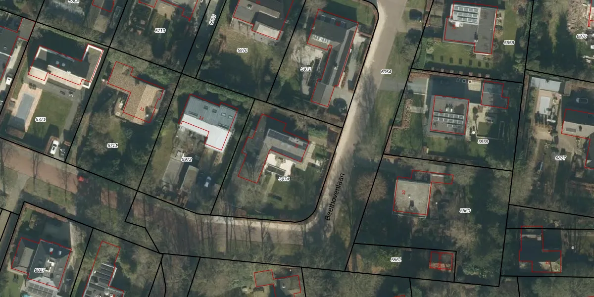 Het perceel waarop Beethovenlaan 14 staat heeft een oppervlakte van 1197 m². Dit is een zeer groot perceel. De perceeloppervlakte wordt geregistreerd door het Kadaster. Gedetailleerde informatie over de maten van dit perceel kunt u vinden in het rapport Kadastrale kaart met maatvoering van Beethovenlaan 14.