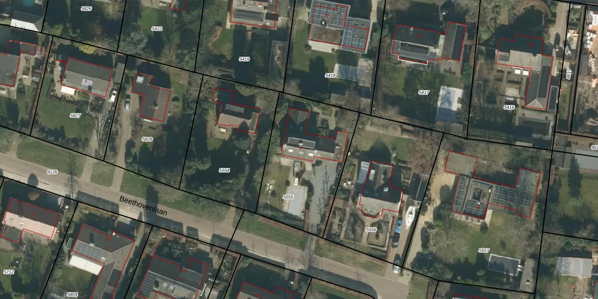 Beethovenlaan 9 is gelegen op kadastraal perceel BDA00E5555. Deze kadastrale aanduiding is uniek en wordt gebruikt door het Kadaster om eigendomsrechten en andere zakelijke rechten vast te leggen. Het perceel maakt onderdeel uit van de kadastrale gemeente Breda.