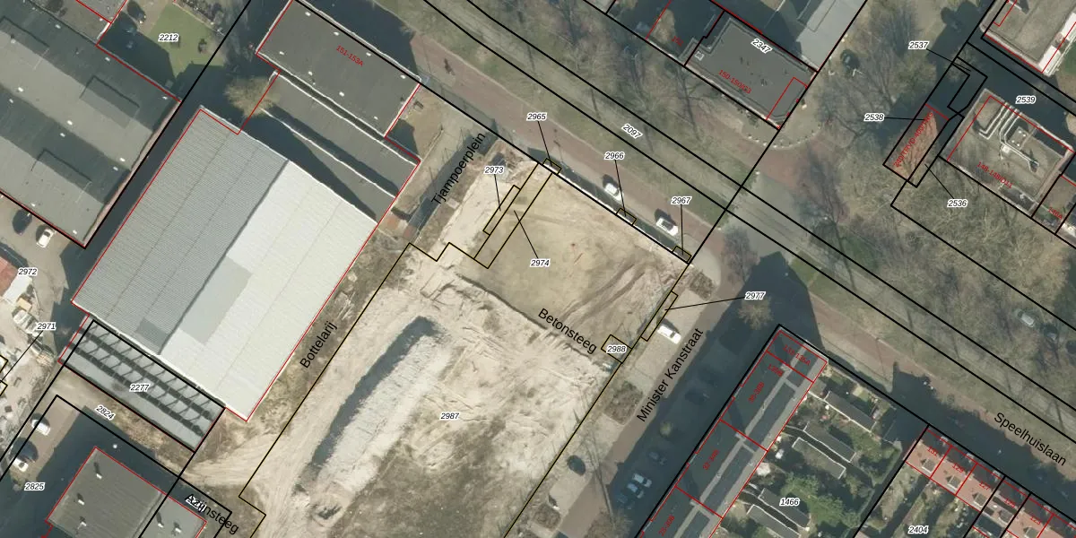 Het perceel waarop Betonsteeg 22 staat heeft een oppervlakte van 3715 m². Dit is een zeer groot perceel. De perceeloppervlakte wordt geregistreerd door het Kadaster. Gedetailleerde informatie over de maten van dit perceel kunt u vinden in het rapport Kadastrale kaart met maatvoering van Betonsteeg 22.