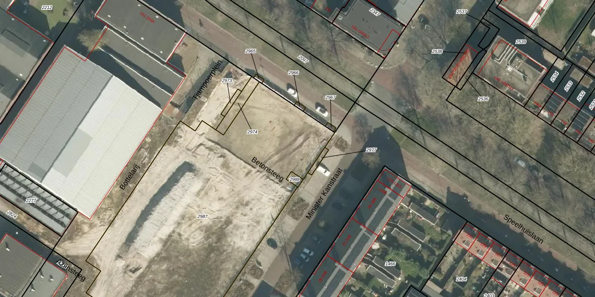 Het perceel waarop Betonsteeg 66 staat heeft een oppervlakte van 3715 m². Dit is een zeer groot perceel. De perceeloppervlakte wordt geregistreerd door het Kadaster. Gedetailleerde informatie over de maten van dit perceel kunt u vinden in het rapport Kadastrale kaart met maatvoering van Betonsteeg 66.