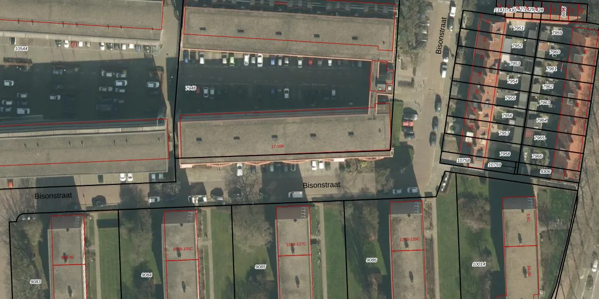 Bisonstraat 113 is gelegen op kadastraal perceel BDA00D7948. Deze kadastrale aanduiding is uniek en wordt gebruikt door het Kadaster om eigendomsrechten en andere zakelijke rechten vast te leggen. Het perceel maakt onderdeel uit van de kadastrale gemeente Breda.