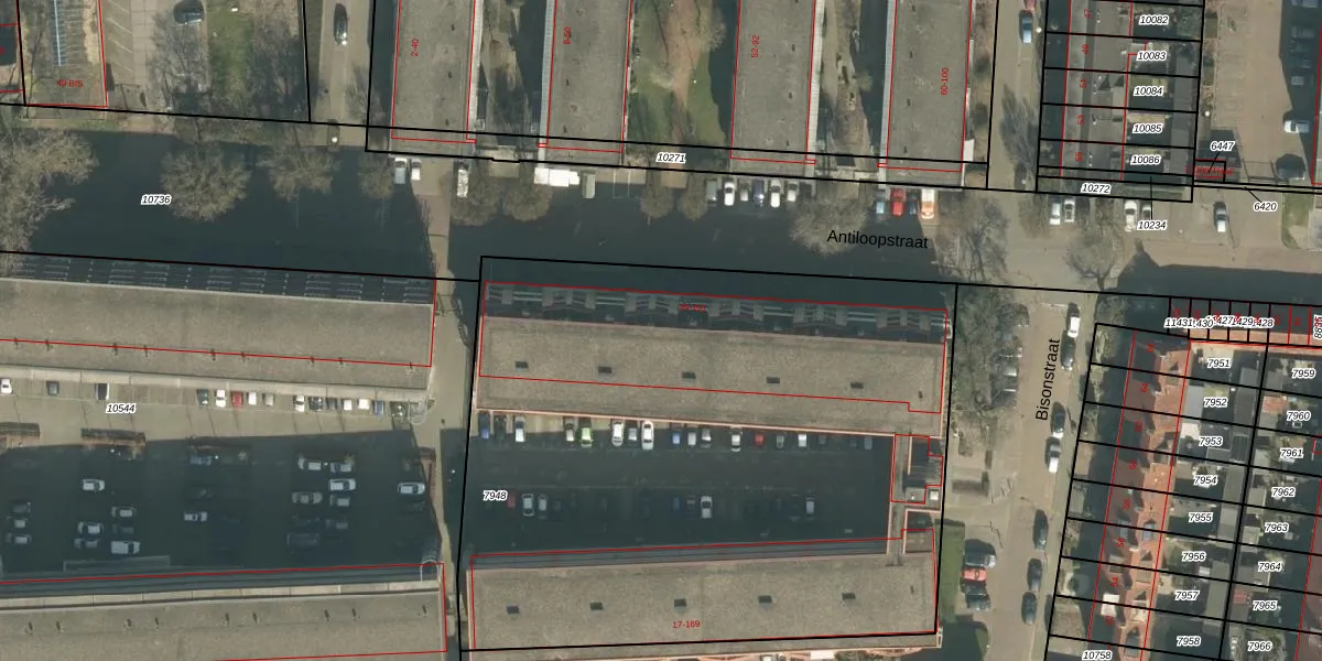 Het perceel waarop Bisonstraat 143 staat heeft een oppervlakte van 4100 m². Dit is een zeer groot perceel. De perceeloppervlakte wordt geregistreerd door het Kadaster. Gedetailleerde informatie over de maten van dit perceel kunt u vinden in het rapport Kadastrale kaart met maatvoering van Bisonstraat 143.
