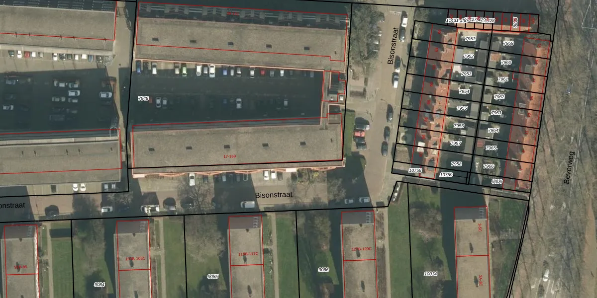 Het perceel waarop Bisonstraat 157 staat heeft een oppervlakte van 4100 m². Dit is een zeer groot perceel. De perceeloppervlakte wordt geregistreerd door het Kadaster. Gedetailleerde informatie over de maten van dit perceel kunt u vinden in het rapport Kadastrale kaart met maatvoering van Bisonstraat 157.