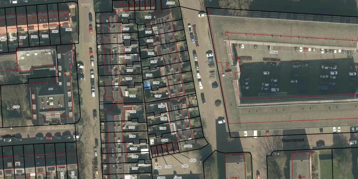 Bisonstraat 16 is gelegen op kadastraal perceel BDA00D7247. Deze kadastrale aanduiding is uniek en wordt gebruikt door het Kadaster om eigendomsrechten en andere zakelijke rechten vast te leggen. Het perceel maakt onderdeel uit van de kadastrale gemeente Breda.