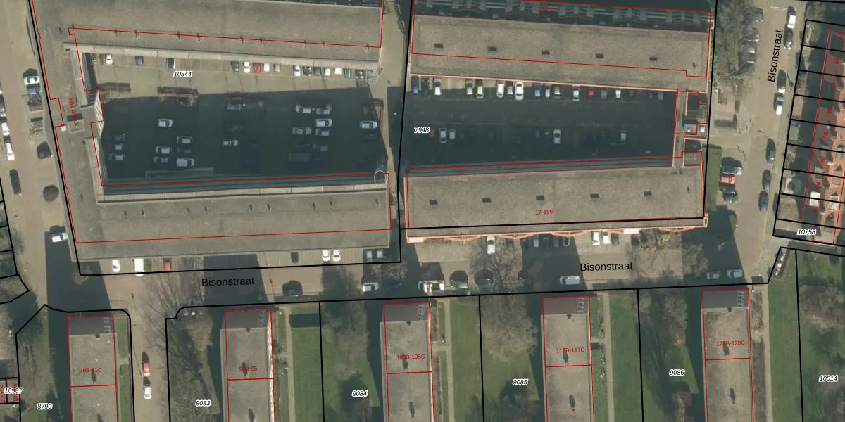 Het perceel waarop Bisonstraat 19 staat heeft een oppervlakte van 4100 m². Dit is een zeer groot perceel. De perceeloppervlakte wordt geregistreerd door het Kadaster. Gedetailleerde informatie over de maten van dit perceel kunt u vinden in het rapport Kadastrale kaart met maatvoering van Bisonstraat 19.