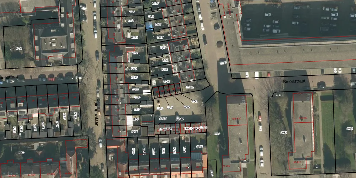 Bisonstraat 26 is gelegen op kadastraal perceel BDA00D9744. Deze kadastrale aanduiding is uniek en wordt gebruikt door het Kadaster om eigendomsrechten en andere zakelijke rechten vast te leggen. Het perceel maakt onderdeel uit van de kadastrale gemeente Breda.