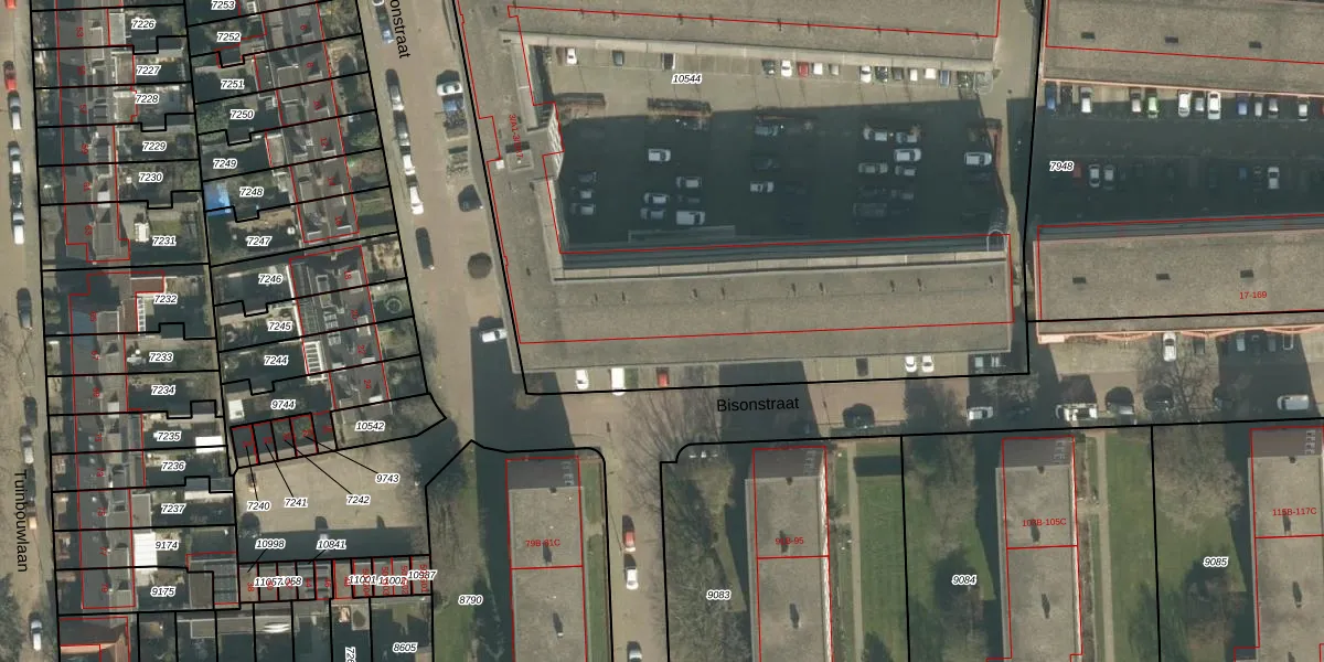 Het perceel waarop Bisonstraat 3-A17 staat heeft een oppervlakte van 5665 m². Dit is een zeer groot perceel. De perceeloppervlakte wordt geregistreerd door het Kadaster. Gedetailleerde informatie over de maten van dit perceel kunt u vinden in het rapport Kadastrale kaart met maatvoering van Bisonstraat 3-A17.