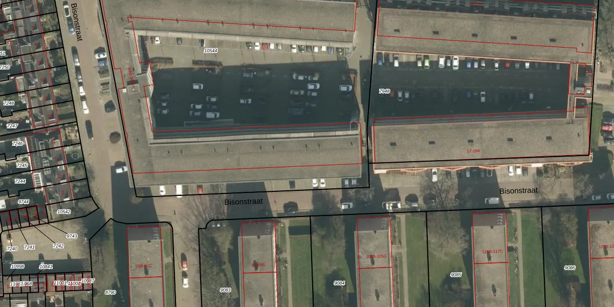 Bisonstraat 3-B40 is gelegen op kadastraal perceel BDA00D10544. Deze kadastrale aanduiding is uniek en wordt gebruikt door het Kadaster om eigendomsrechten en andere zakelijke rechten vast te leggen. Het perceel maakt onderdeel uit van de kadastrale gemeente Breda.