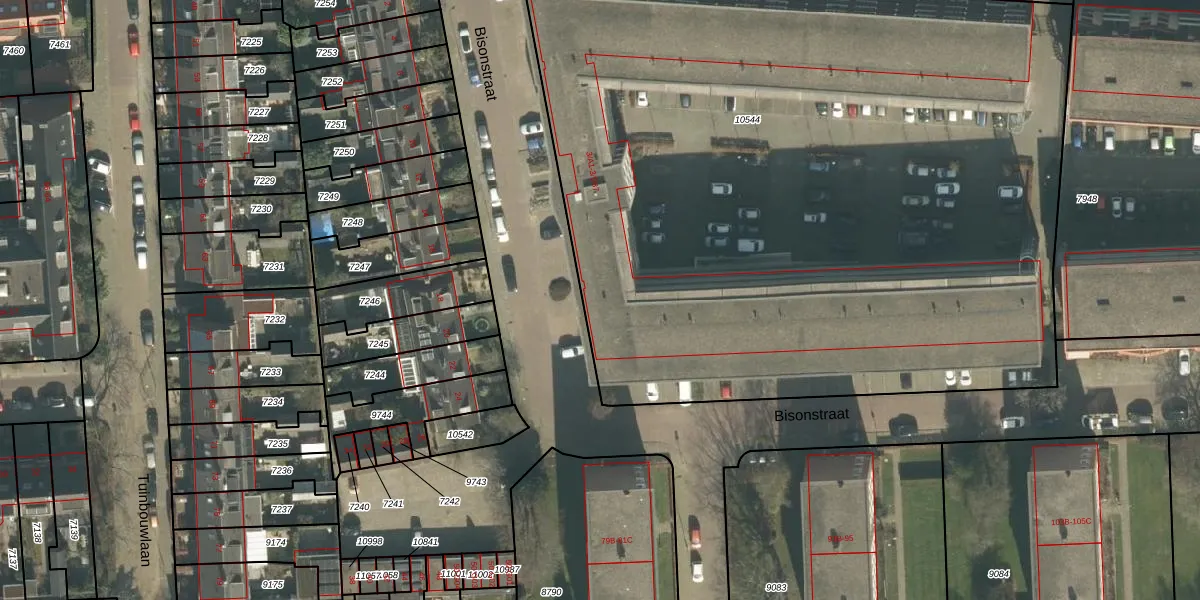 Het perceel waarop Bisonstraat 3-D78 staat heeft een oppervlakte van 5665 m². Dit is een zeer groot perceel. De perceeloppervlakte wordt geregistreerd door het Kadaster. Gedetailleerde informatie over de maten van dit perceel kunt u vinden in het rapport Kadastrale kaart met maatvoering van Bisonstraat 3-D78.