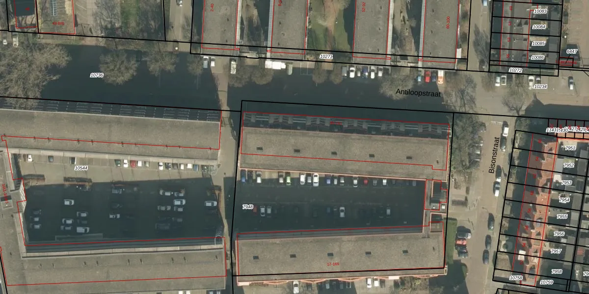 Het perceel waarop Bisonstraat 57 staat heeft een oppervlakte van 4100 m². Dit is een zeer groot perceel. De perceeloppervlakte wordt geregistreerd door het Kadaster. Gedetailleerde informatie over de maten van dit perceel kunt u vinden in het rapport Kadastrale kaart met maatvoering van Bisonstraat 57.