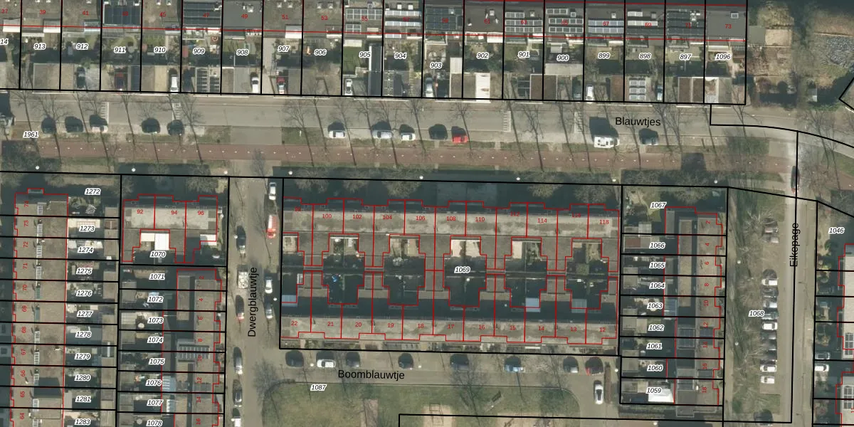 Blauwtjes 106 is gelegen op kadastraal perceel PCH00P1069. Deze kadastrale aanduiding is uniek en wordt gebruikt door het Kadaster om eigendomsrechten en andere zakelijke rechten vast te leggen. Het perceel maakt onderdeel uit van de kadastrale gemeente Princenhage.