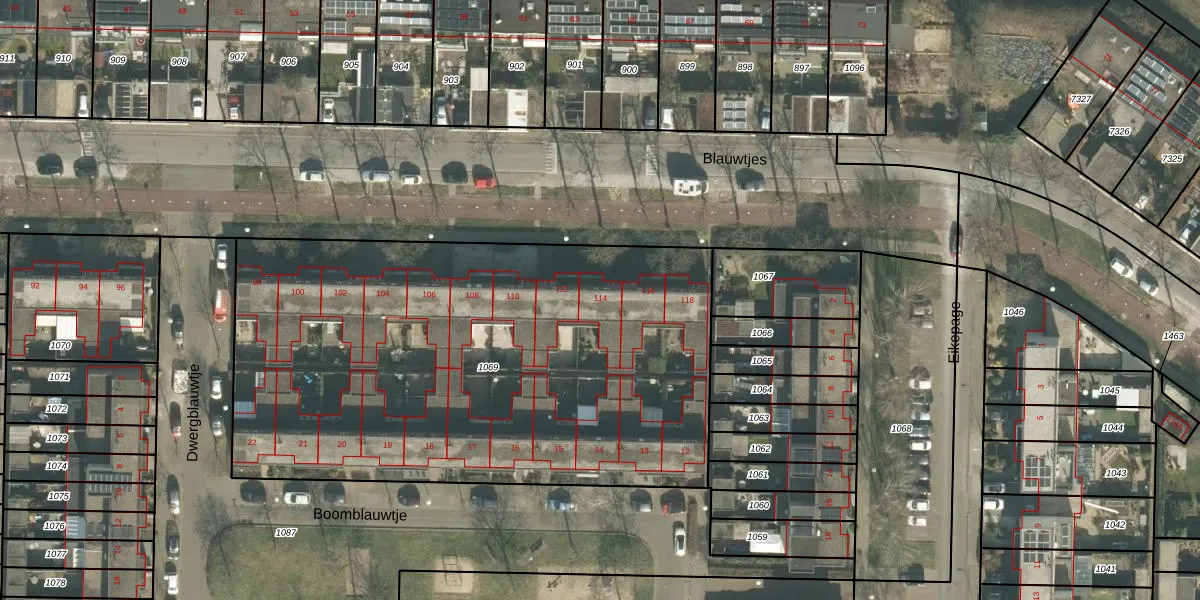 Blauwtjes 114 is gelegen op kadastraal perceel PCH00P1069. Deze kadastrale aanduiding is uniek en wordt gebruikt door het Kadaster om eigendomsrechten en andere zakelijke rechten vast te leggen. Het perceel maakt onderdeel uit van de kadastrale gemeente Princenhage.