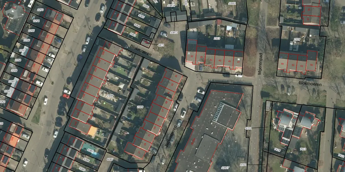 Het perceel waarop Blokmoeren 33 staat heeft een oppervlakte van 1619 m². Dit is een zeer groot perceel. De perceeloppervlakte wordt geregistreerd door het Kadaster. Gedetailleerde informatie over de maten van dit perceel kunt u vinden in het rapport Kadastrale kaart met maatvoering van Blokmoeren 33.