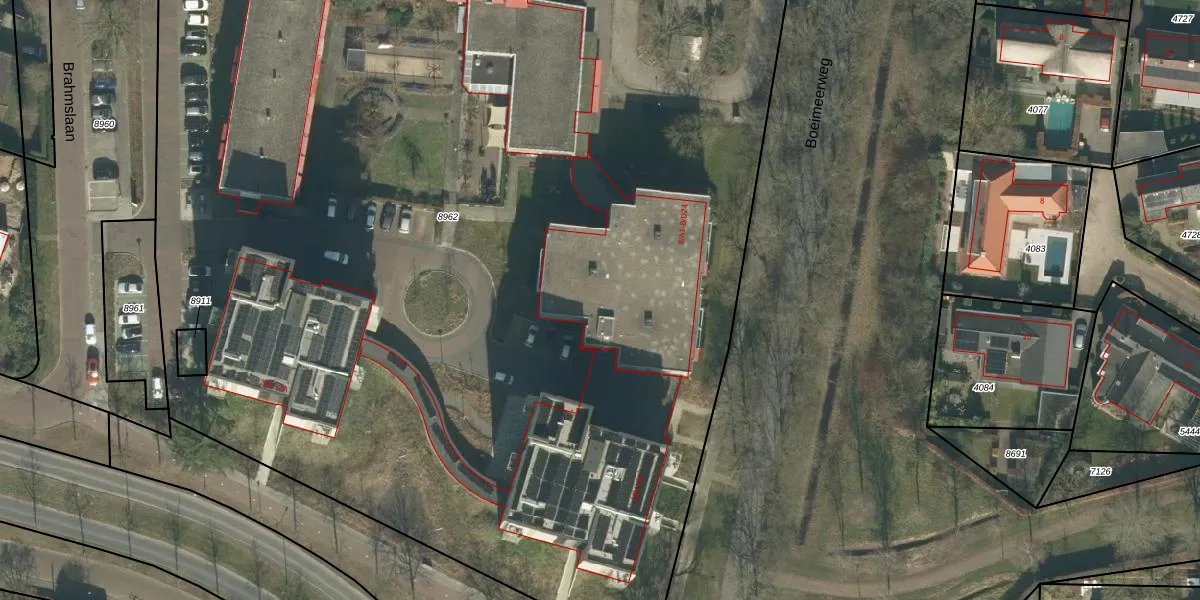 Het perceel waarop Brahmslaan 8-A2 staat heeft een oppervlakte van 1,9 ha. Dit is een zeer groot perceel. De perceeloppervlakte wordt geregistreerd door het Kadaster. Gedetailleerde informatie over de maten van dit perceel kunt u vinden in het rapport Kadastrale kaart met maatvoering van Brahmslaan 8-A2.