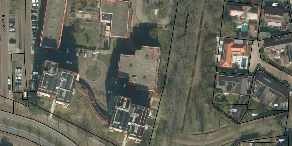 Het perceel waarop Brahmslaan 8-A5 staat heeft een oppervlakte van 1,9 ha. Dit is een zeer groot perceel. De perceeloppervlakte wordt geregistreerd door het Kadaster. Gedetailleerde informatie over de maten van dit perceel kunt u vinden in het rapport Kadastrale kaart met maatvoering van Brahmslaan 8-A5.