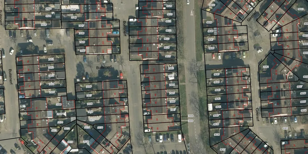 Buitenerf 100 is gelegen op kadastraal perceel BDA00H7663. Deze kadastrale aanduiding is uniek en wordt gebruikt door het Kadaster om eigendomsrechten en andere zakelijke rechten vast te leggen. Het perceel maakt onderdeel uit van de kadastrale gemeente Breda.