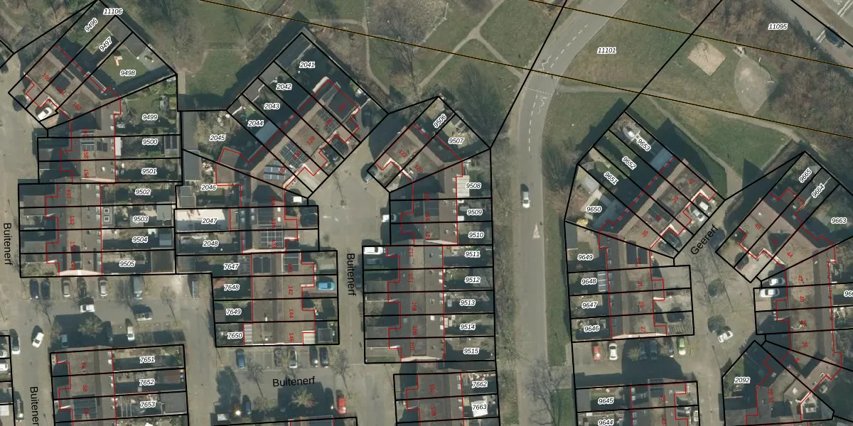 Buitenerf 116 is gelegen op kadastraal perceel BDA00H9509. Deze kadastrale aanduiding is uniek en wordt gebruikt door het Kadaster om eigendomsrechten en andere zakelijke rechten vast te leggen. Het perceel maakt onderdeel uit van de kadastrale gemeente Breda.