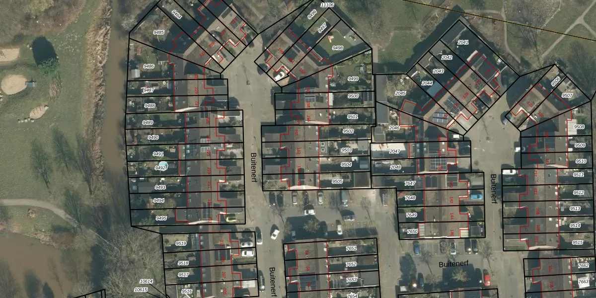 Het perceel waarop Buitenerf 152 staat heeft een oppervlakte van 197 m². Dit is een middelgroot perceel. De perceeloppervlakte wordt geregistreerd door het Kadaster. Gedetailleerde informatie over de maten van dit perceel kunt u vinden in het rapport Kadastrale kaart met maatvoering van Buitenerf 152.