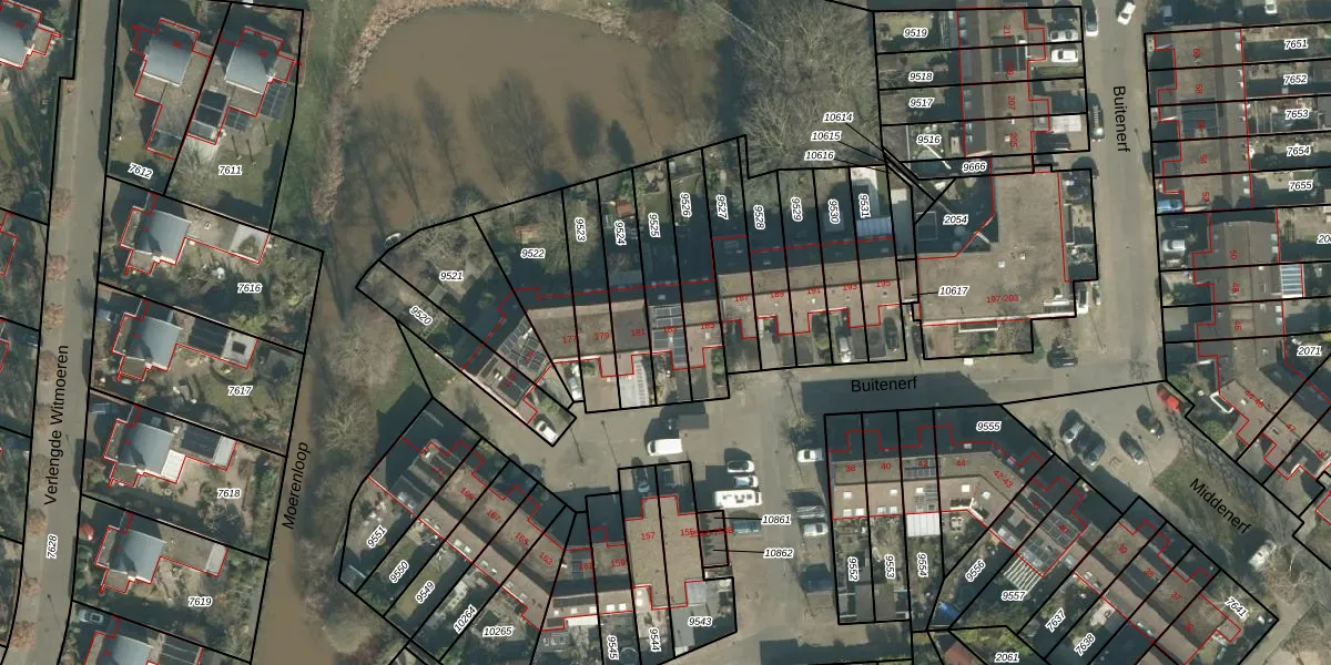 Het perceel waarop Buitenerf 183 staat heeft een oppervlakte van 196 m². Dit is een middelgroot perceel. De perceeloppervlakte wordt geregistreerd door het Kadaster. Gedetailleerde informatie over de maten van dit perceel kunt u vinden in het rapport Kadastrale kaart met maatvoering van Buitenerf 183.