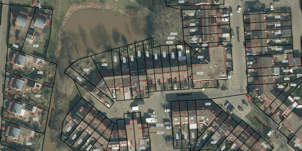Het perceel waarop Buitenerf 187 staat heeft een oppervlakte van 187 m². Dit is een middelgroot perceel. De perceeloppervlakte wordt geregistreerd door het Kadaster. Gedetailleerde informatie over de maten van dit perceel kunt u vinden in het rapport Kadastrale kaart met maatvoering van Buitenerf 187.