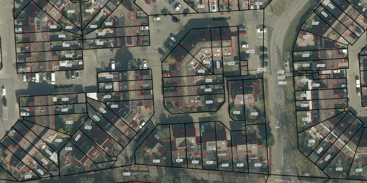 Buitenerf 19 is gelegen op kadastraal perceel BDA00H9592. Deze kadastrale aanduiding is uniek en wordt gebruikt door het Kadaster om eigendomsrechten en andere zakelijke rechten vast te leggen. Het perceel maakt onderdeel uit van de kadastrale gemeente Breda.