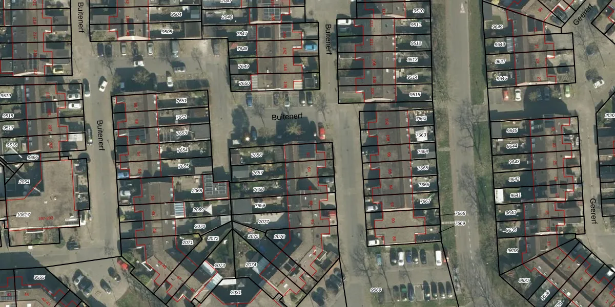 Buitenerf 62 is gelegen op kadastraal perceel BDA00H7656. Deze kadastrale aanduiding is uniek en wordt gebruikt door het Kadaster om eigendomsrechten en andere zakelijke rechten vast te leggen. Het perceel maakt onderdeel uit van de kadastrale gemeente Breda.