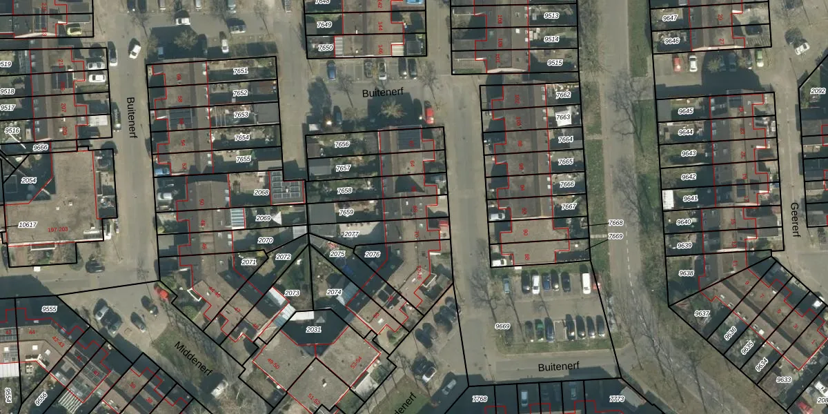 Het perceel waarop Buitenerf 68 staat heeft een oppervlakte van 182 m². Dit is een middelgroot perceel. De perceeloppervlakte wordt geregistreerd door het Kadaster. Gedetailleerde informatie over de maten van dit perceel kunt u vinden in het rapport Kadastrale kaart met maatvoering van Buitenerf 68.