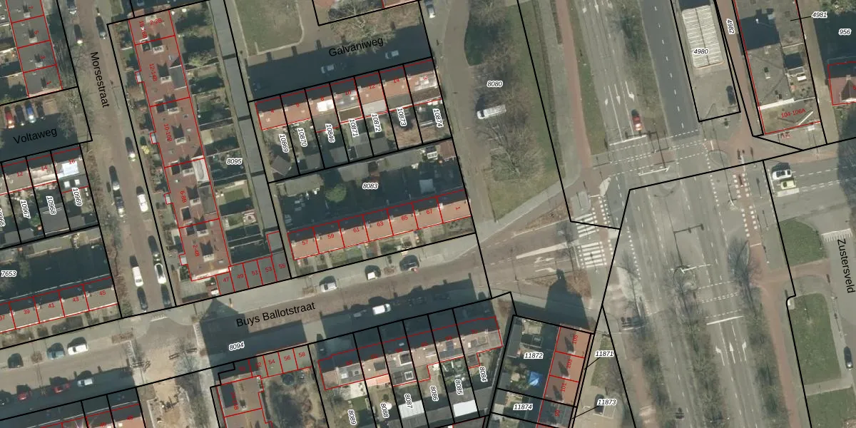 Het perceel waarop Buys Ballotstraat 67 staat heeft een oppervlakte van 1008 m². Dit is een zeer groot perceel. De perceeloppervlakte wordt geregistreerd door het Kadaster. Gedetailleerde informatie over de maten van dit perceel kunt u vinden in het rapport Kadastrale kaart met maatvoering van Buys Ballotstraat 67.