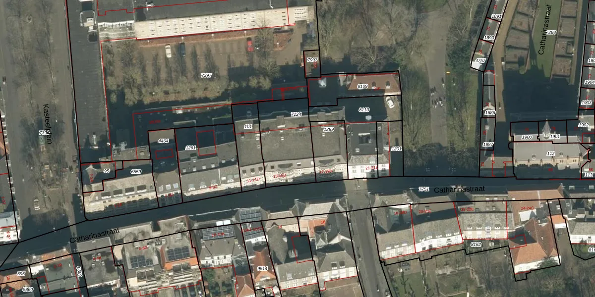 Het perceel waarop Catharinastraat 15-C staat heeft een oppervlakte van 489 m². Dit is een groot perceel. De perceeloppervlakte wordt geregistreerd door het Kadaster. Gedetailleerde informatie over de maten van dit perceel kunt u vinden in het rapport Kadastrale kaart met maatvoering van Catharinastraat 15-C.