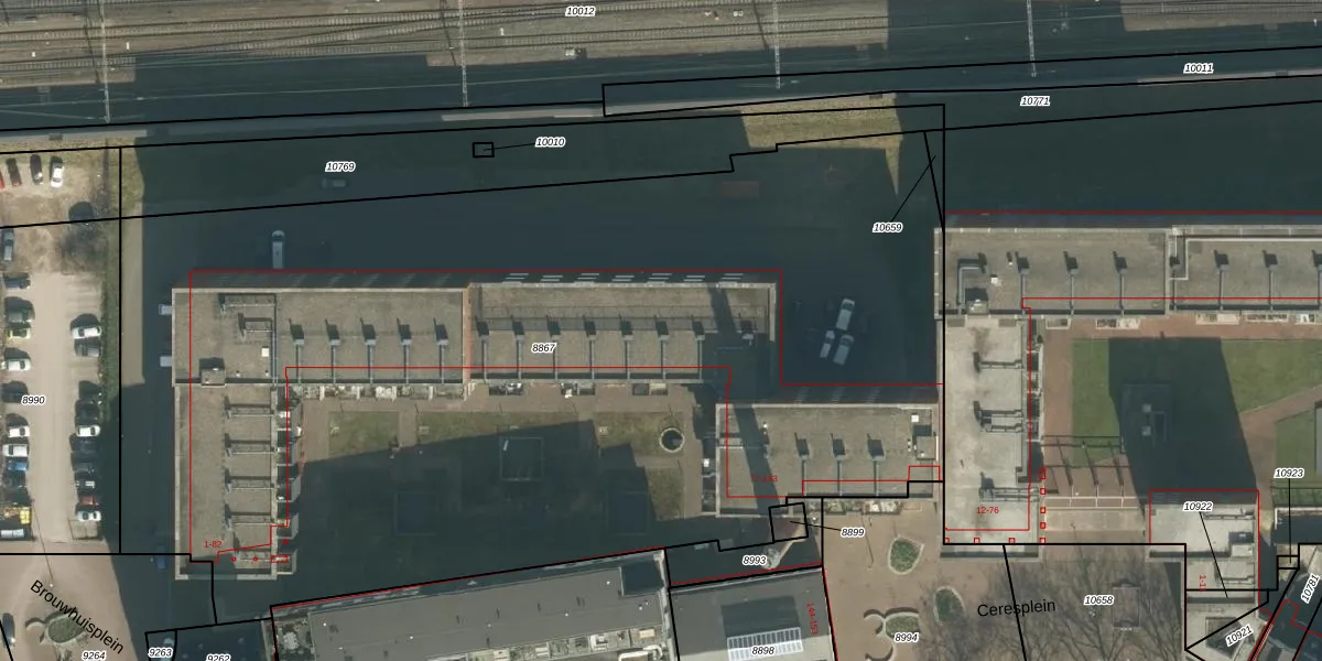 Het perceel waarop Ceresplein 106 staat heeft een oppervlakte van 6995 m². Dit is een zeer groot perceel. De perceeloppervlakte wordt geregistreerd door het Kadaster. Gedetailleerde informatie over de maten van dit perceel kunt u vinden in het rapport Kadastrale kaart met maatvoering van Ceresplein 106.