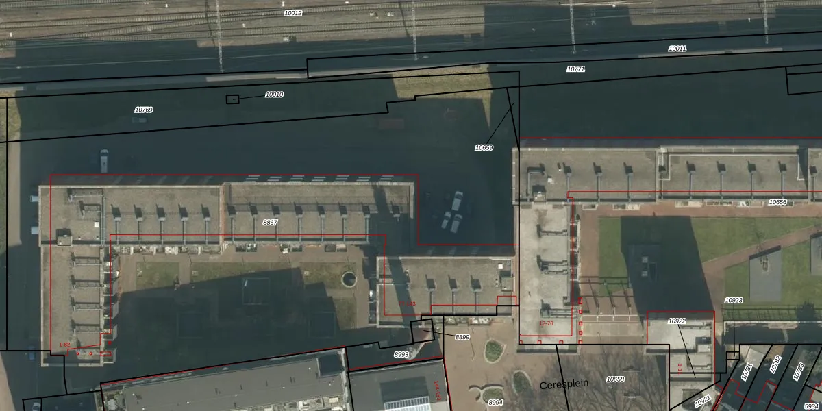 Het perceel waarop Ceresplein 115 staat heeft een oppervlakte van 6995 m². Dit is een zeer groot perceel. De perceeloppervlakte wordt geregistreerd door het Kadaster. Gedetailleerde informatie over de maten van dit perceel kunt u vinden in het rapport Kadastrale kaart met maatvoering van Ceresplein 115.