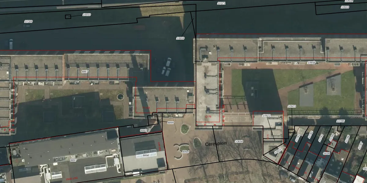 Het perceel waarop Ceresplein 122 staat heeft een oppervlakte van 6995 m². Dit is een zeer groot perceel. De perceeloppervlakte wordt geregistreerd door het Kadaster. Gedetailleerde informatie over de maten van dit perceel kunt u vinden in het rapport Kadastrale kaart met maatvoering van Ceresplein 122.