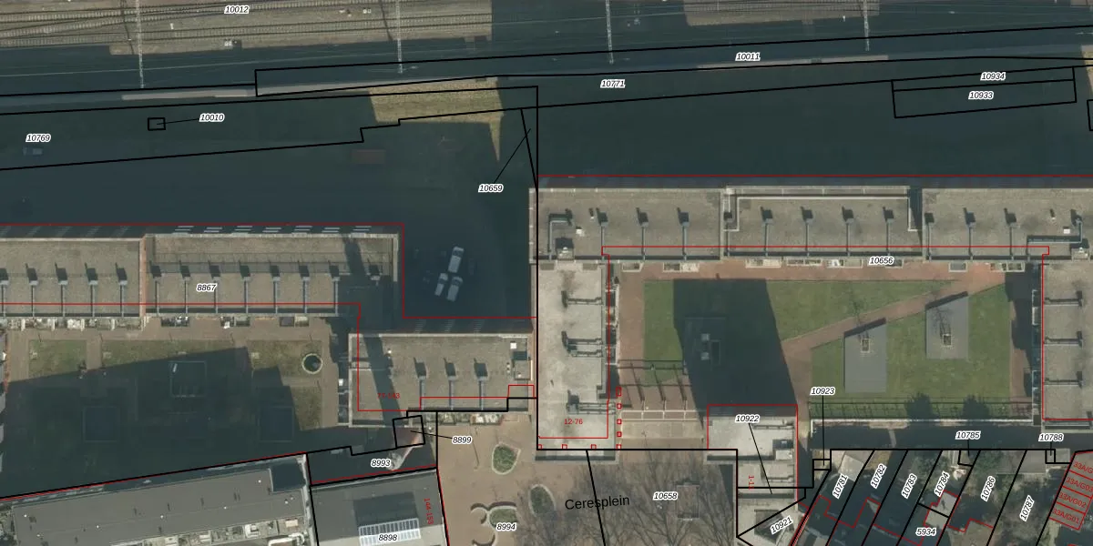 Het perceel waarop Ceresplein 13 staat heeft een oppervlakte van 7449 m². Dit is een zeer groot perceel. De perceeloppervlakte wordt geregistreerd door het Kadaster. Gedetailleerde informatie over de maten van dit perceel kunt u vinden in het rapport Kadastrale kaart met maatvoering van Ceresplein 13.