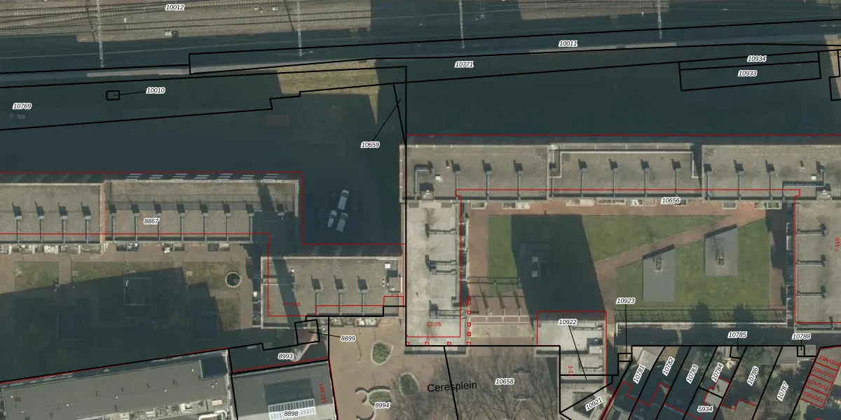 Het perceel waarop Ceresplein 25 staat heeft een oppervlakte van 7449 m². Dit is een zeer groot perceel. De perceeloppervlakte wordt geregistreerd door het Kadaster. Gedetailleerde informatie over de maten van dit perceel kunt u vinden in het rapport Kadastrale kaart met maatvoering van Ceresplein 25.