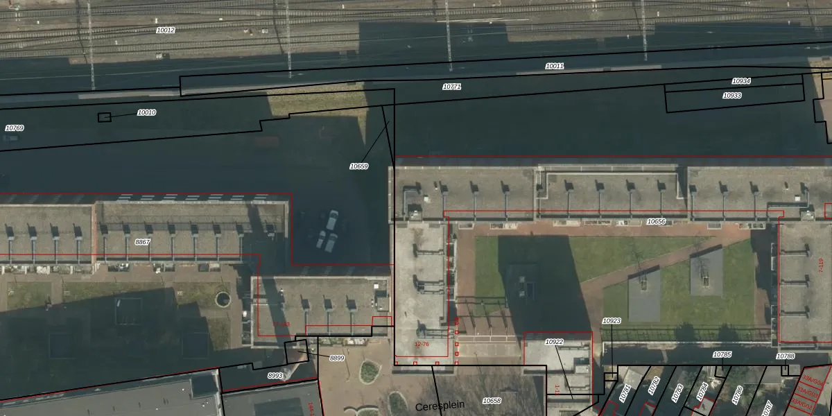 Het perceel waarop Ceresplein 38 staat heeft een oppervlakte van 7449 m². Dit is een zeer groot perceel. De perceeloppervlakte wordt geregistreerd door het Kadaster. Gedetailleerde informatie over de maten van dit perceel kunt u vinden in het rapport Kadastrale kaart met maatvoering van Ceresplein 38.