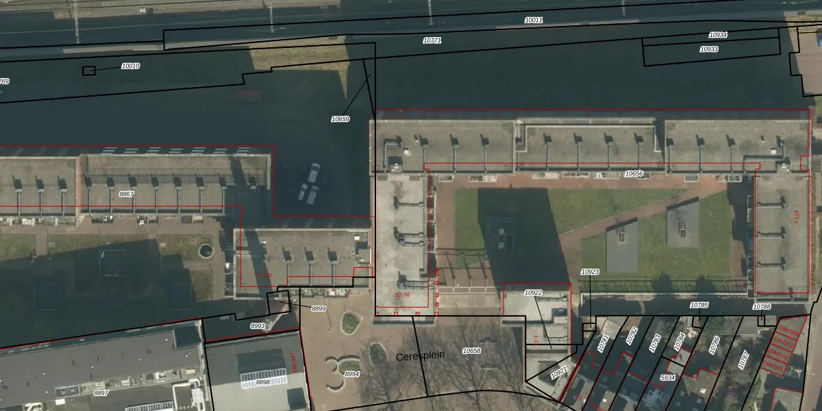 Het perceel waarop Ceresplein 60 staat heeft een oppervlakte van 7449 m². Dit is een zeer groot perceel. De perceeloppervlakte wordt geregistreerd door het Kadaster. Gedetailleerde informatie over de maten van dit perceel kunt u vinden in het rapport Kadastrale kaart met maatvoering van Ceresplein 60.