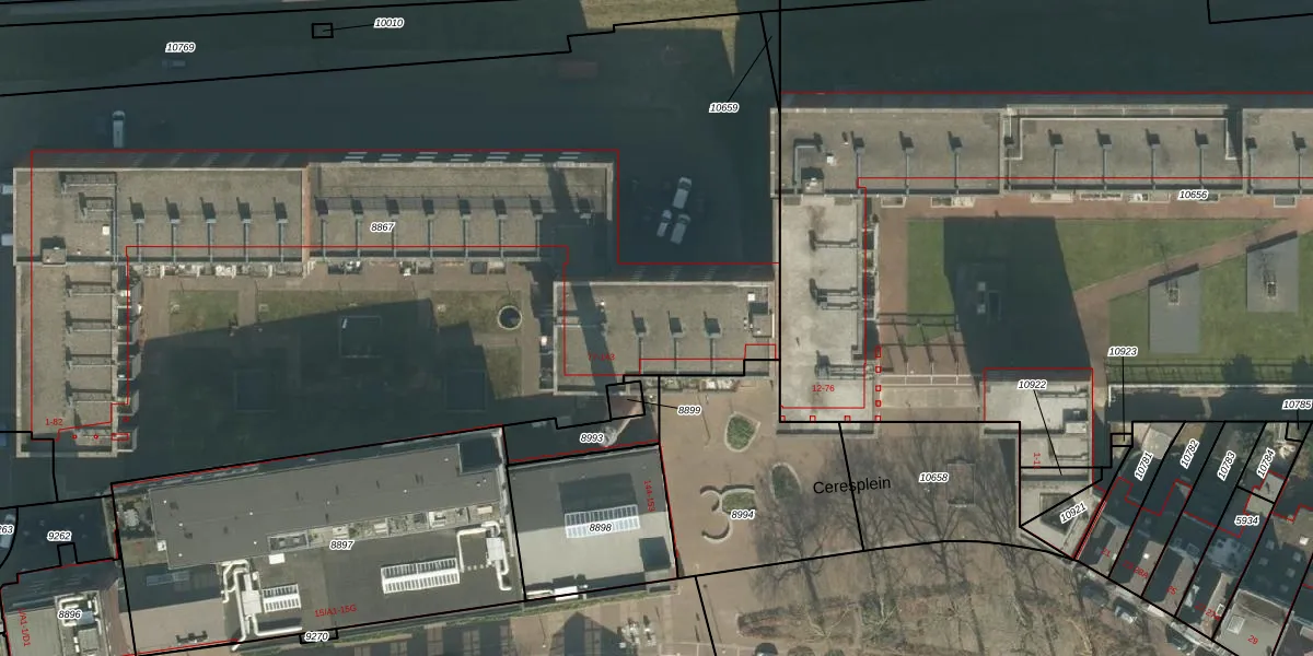 Het perceel waarop Ceresplein 90 staat heeft een oppervlakte van 6995 m². Dit is een zeer groot perceel. De perceeloppervlakte wordt geregistreerd door het Kadaster. Gedetailleerde informatie over de maten van dit perceel kunt u vinden in het rapport Kadastrale kaart met maatvoering van Ceresplein 90.