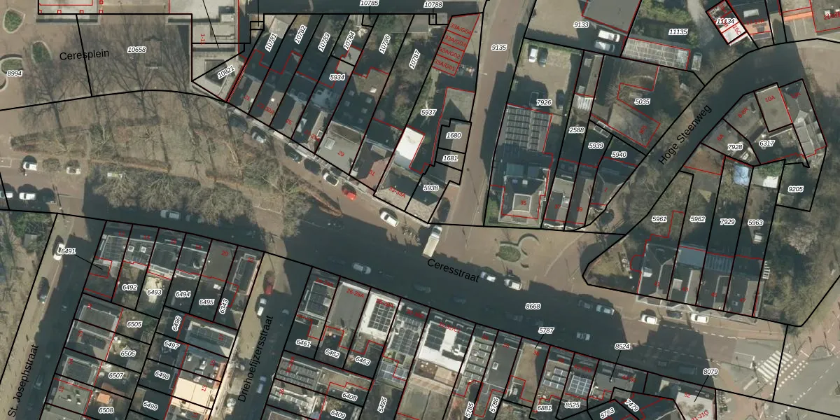 Het perceel waarop Ceresstraat 33-A staat heeft een oppervlakte van 93 m². Dit is een klein perceel. De perceeloppervlakte wordt geregistreerd door het Kadaster. Gedetailleerde informatie over de maten van dit perceel kunt u vinden in het rapport Kadastrale kaart met maatvoering van Ceresstraat 33-A.