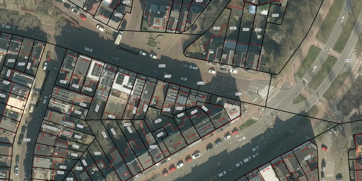 Het perceel waarop Ceresstraat 42 staat heeft een oppervlakte van 93 m². Dit is een klein perceel. De perceeloppervlakte wordt geregistreerd door het Kadaster. Gedetailleerde informatie over de maten van dit perceel kunt u vinden in het rapport Kadastrale kaart met maatvoering van Ceresstraat 42.