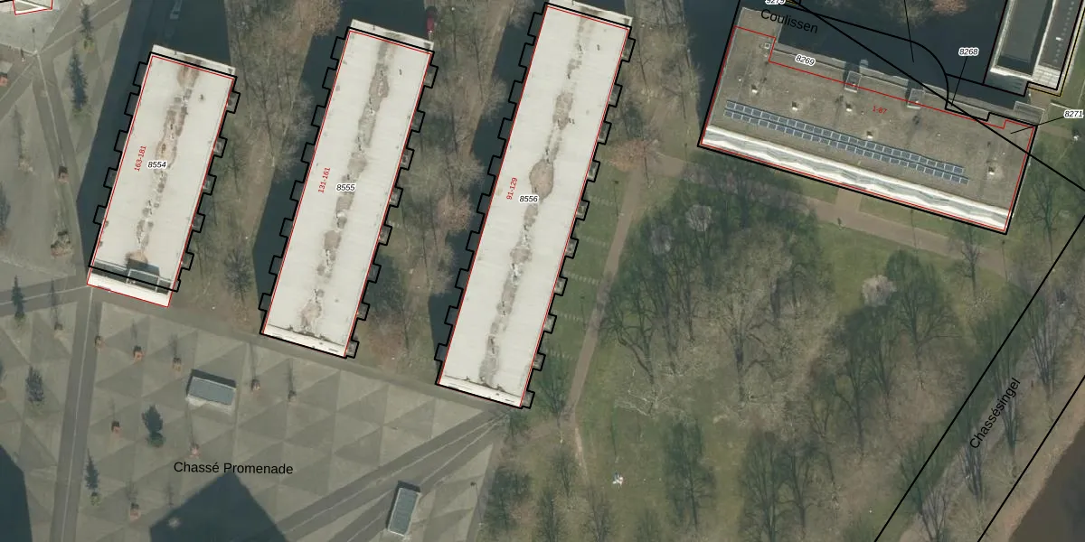 Het perceel waarop Coulissen 103 staat heeft een oppervlakte van 1311 m². Dit is een zeer groot perceel. De perceeloppervlakte wordt geregistreerd door het Kadaster. Gedetailleerde informatie over de maten van dit perceel kunt u vinden in het rapport Kadastrale kaart met maatvoering van Coulissen 103.