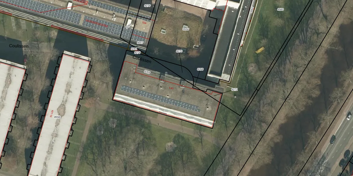 Het perceel waarop Coulissen 49 staat heeft een oppervlakte van 1417 m². Dit is een zeer groot perceel. De perceeloppervlakte wordt geregistreerd door het Kadaster. Gedetailleerde informatie over de maten van dit perceel kunt u vinden in het rapport Kadastrale kaart met maatvoering van Coulissen 49.