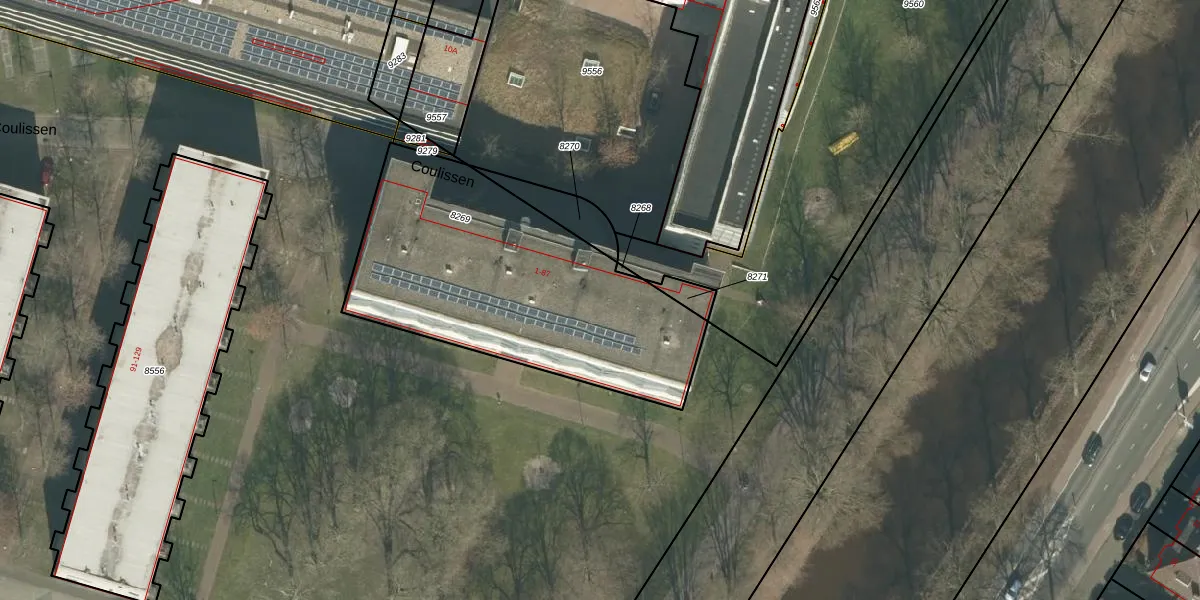 Het perceel waarop Coulissen 63 staat heeft een oppervlakte van 1417 m². Dit is een zeer groot perceel. De perceeloppervlakte wordt geregistreerd door het Kadaster. Gedetailleerde informatie over de maten van dit perceel kunt u vinden in het rapport Kadastrale kaart met maatvoering van Coulissen 63.