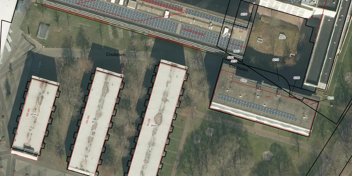 Het perceel waarop Coulissen 93 staat heeft een oppervlakte van 1311 m². Dit is een zeer groot perceel. De perceeloppervlakte wordt geregistreerd door het Kadaster. Gedetailleerde informatie over de maten van dit perceel kunt u vinden in het rapport Kadastrale kaart met maatvoering van Coulissen 93.