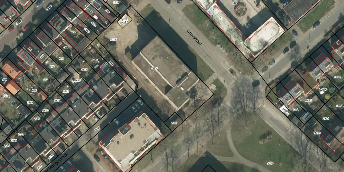 Het perceel waarop Croystraat 16 staat heeft een oppervlakte van 2047 m². Dit is een zeer groot perceel. De perceeloppervlakte wordt geregistreerd door het Kadaster. Gedetailleerde informatie over de maten van dit perceel kunt u vinden in het rapport Kadastrale kaart met maatvoering van Croystraat 16.